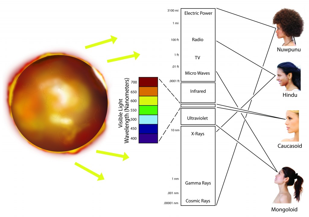 The diagram above demonstrates how the different races of people process light into their bodies. If you notice that Nuwpunu peoples bodies can process and absorb Full Spectrum Light into their bodies, this is also the reason why Nuwpunu peoples have what is called Woolly Hair [which is really Sun Hair] Nuwpunu peoples hair works as an antenna making it easier to absorb and process natural light into their bodies.