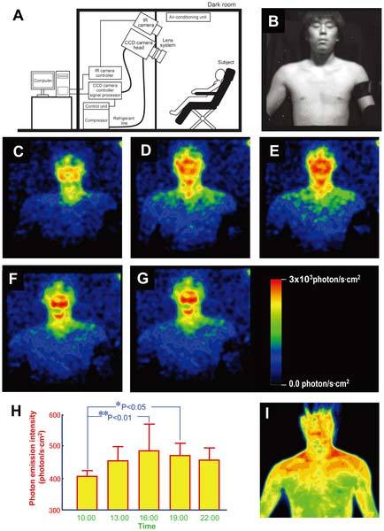 To learn more about this faint visible light, scientists in Japan employed extraordinarily sensitive cameras capable of detecting single photons. Five healthy male volunteers in their 20s were placed bare-chested in front of the cameras in complete darkness in light-tight rooms for 20 minutes every three hours from 10 a.m. to 10 p.m. for three days.